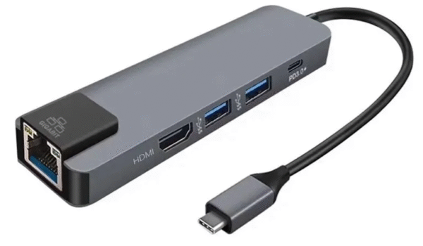 5 portas multifuncionais, 1x 4K HDMI, 2x USB 3.0, 1x PD Carga Rápida 65W, 1x porta Ethernet 100M (porta RJ45)