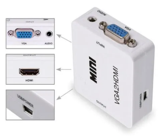 É usado para converter vídeo VGA e sinal de áudio analógico de 3.5mm em seu computador para sinal HDMI.
